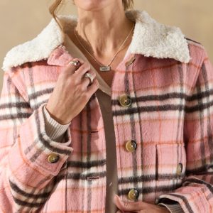 So cozy. our perfect plaid jacket has both functional and stylish utility pockets with flaps at the top and a side entry. warm Sherpa collar and a beautiful printed floral lining. Polyester/wool. Dry clean. Imported. Exclusive. Sizes XXS (00). XS (0??). S (4??). M (8??0). L (12??4). XL (16??8). Approx. 21l.