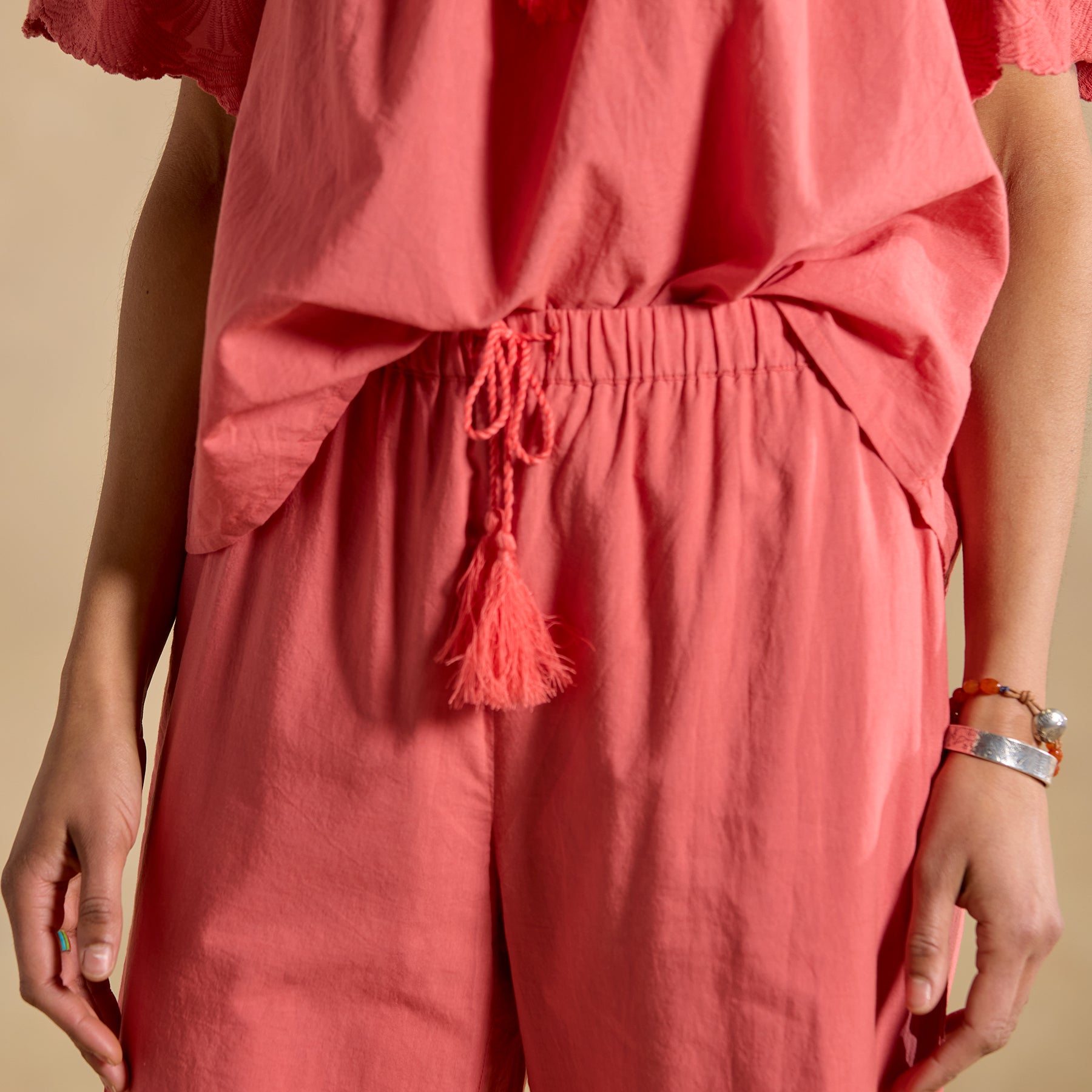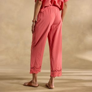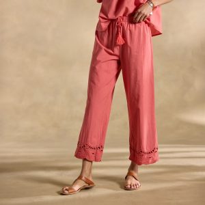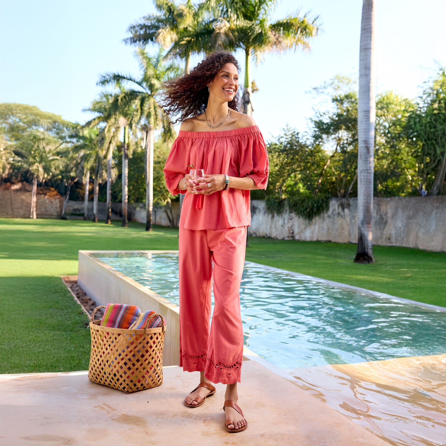 Easy. breezy cropped pants embellished with cut-out detailing and embroidery at hem. Smocked. elastic waistband with braided ties. Cotton. Machine wash. Imported. Sizes XS (4). S (6). M (8?C10). L (12). XL (14). XXL (16). 26 inseam.